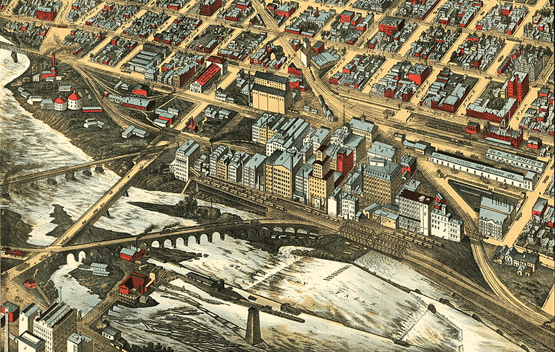 Lumber mills, flour mills and hydroelectric power grew out of the Falls, and a major city was born. The area around the Falls was honeycombed with channels, canals, tailraces and other means of harvesting the immense power of St. Anthony Falls.