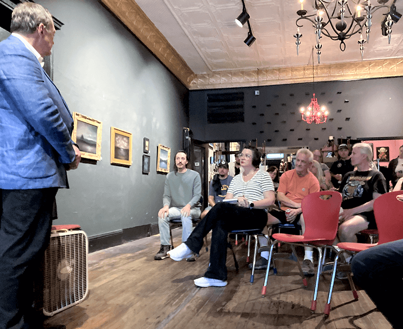 Ward 3 City Council Member Michael Rainville addresses Sheridan neighborhood residents at Rogue Buddha Gallery on September 26 about recent incidents at Mayslack’s Bar and Grill. (Mark Peterson)