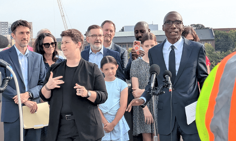 Senator Bobby Joe Champion, on the right, speaks at the newly named Minnesota Senate Majority Leader Kari Dziedzic Memorial Bridge on October 1. Minneapolis City Council Member Michael Rainville, Senator Doron Clark and many other elected officials attended the event. (Michael McKinney)