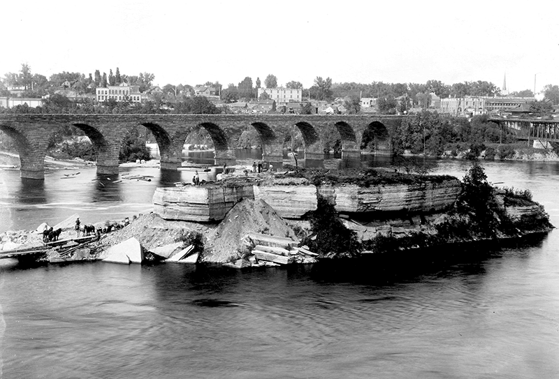 Spirit Island was destroyed during the construction of the St. Anthony Falls Lock and Dam. This photo shows crews quarrying the island in 1899. (Hennepin County Library)