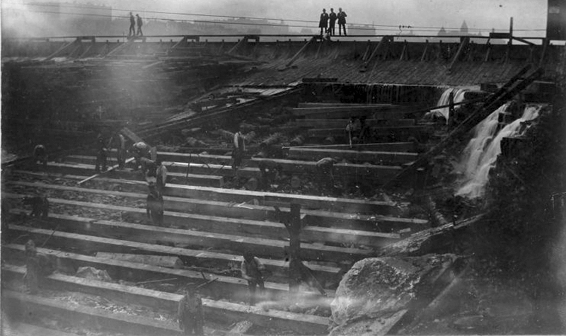 Construction of the wooden apron over the falls in 1894. Xcel Energy replaced the wood with concrete in 1955. (MN Digital)
