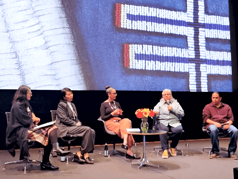 The panel included an acknowledgement of the histories of exclusion, divisiveness and erasure of Native peoples within institutions. Panelist Heather Ahtone shared some of her history, including the ways that objects crafted by relatives could end up next to labels in museums. Heather went on to speak about the role of art and artists. “It is not the artist’s job to teach you everything that you need to know and to learn,” she said, “but go and find out … ask smarter questions.”
