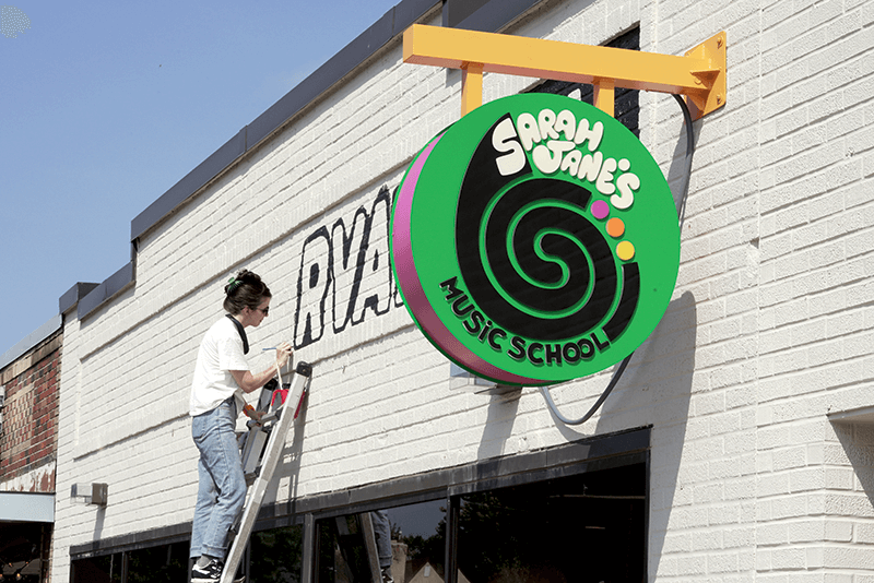 Maggie Luck paints the “Music Conservatory” sign in front of Sarah Jane’s Music School on August 29. (Davis Steen)