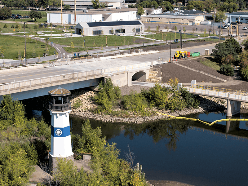 The project was done by the Minneapolis Park & Recreation Board (MPRB), which manages the walking path between Boom Island Park and Graco Park. The plan was to connect the path between the two parks with a new pedestrian bridge over the Boom Island marina with an underpass on the east bank side of the bridge’s foundation.